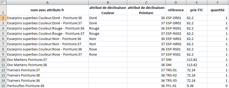 Dans l'exemple ci-dessus, nous avons décidé d'exporter les attributs de déclinaisons 'couleur' & 'pointure'.