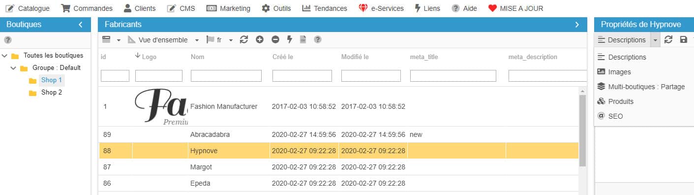 La colonne des Propriétés, à droite, vous permet d'ajouter le logo de vos fabricants, pour un joli visuel sur votre front office, ainsi qu'une description pour ajouter un peu d'informations sur chacun de vos fabricants.