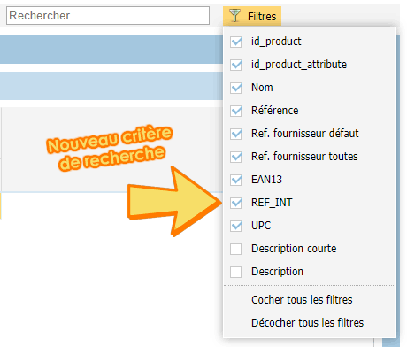 Nous allons ajouter le nouveau champ "REF_INT" de la fiche produit PrestaShop dans les critères du moteur de recherche de Store Commander.