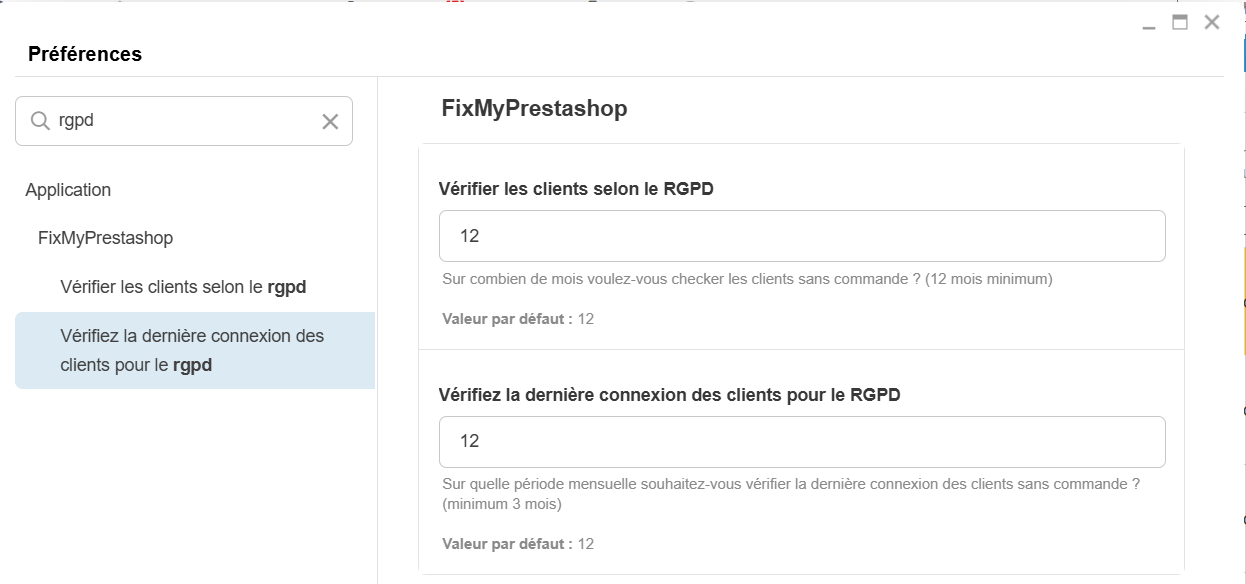 Pour définir la période (comptes créés depuis X mois), naviguez dans Outils > Préférences > Application > FixMyPrestaShop > Vérifier les clients selon le RGPD : saisissez le nombre de mois dans la colonne Valeur.
