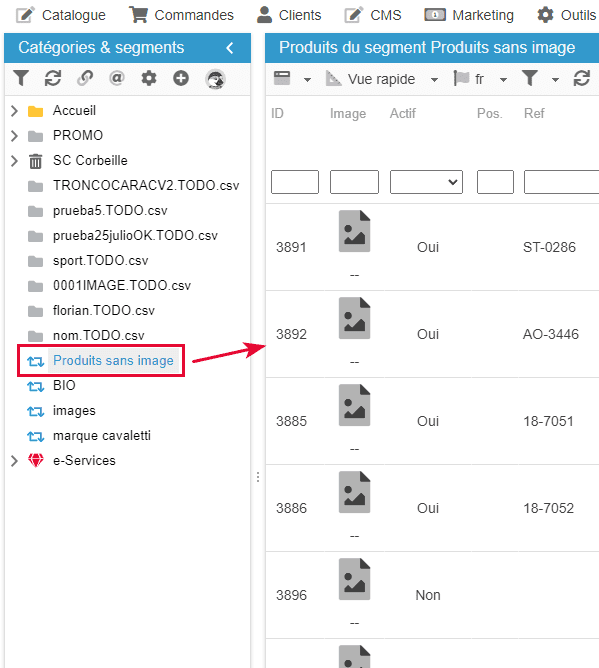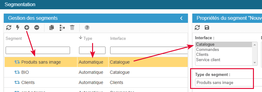 En effet, l'outil de Segmentation permet de créer un segment automatique affiché dans l'interface Catalogue avec le type 'produits sans image'.