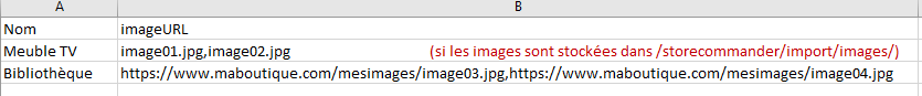 Lors de la création de votre fichier CSV, vous devrez inclure un identifiant du produit (nom, référence ou ID), puis une colonne contenant l'URL des images (voir l'article correspondant ici), séparée par des virgules, si le séparateur de valeur de votre configuration d'import est également la virgule.