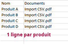 En revanche, si vous avez le même document à associer à plusieurs produits, votre fichier CSV utilisera le format suivant :