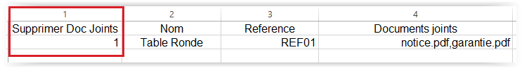Votre fichier CSV devra inclure cette colonne de suppression en tout début de fichier (car ce sera la première action qui sera prise en compte lors du processus d'import), avec la valeur 1 (pour oui), et éventuellement une colonne 'documents joints' pour associer les nouveaux documents.