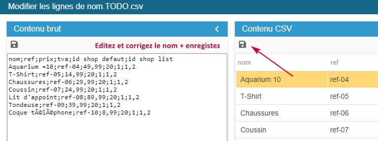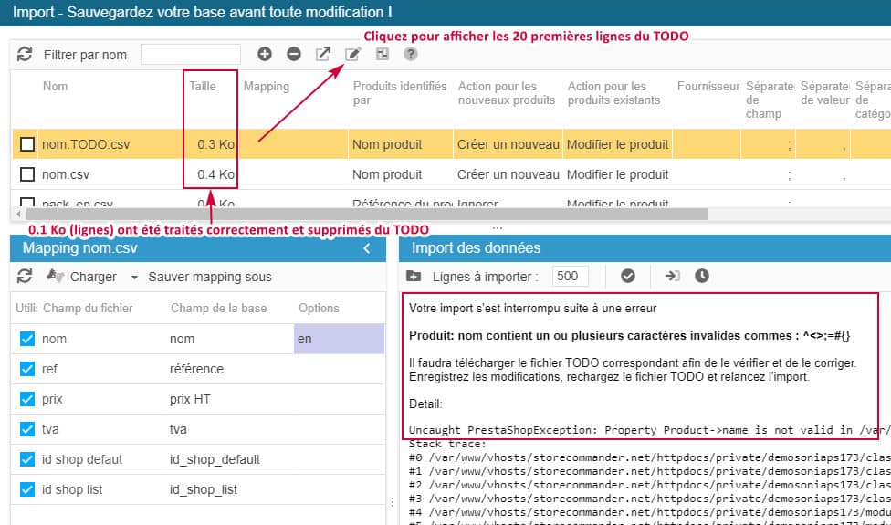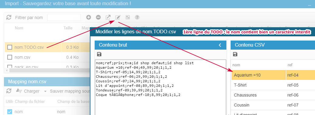 En prenant l'exemple de l'erreur 'name is not valid' qui interrompt l'import. On sélectionne le fichier TODO pour ouvrir l'édition rapide => vérifiez la première ligne => éditez + corriger => enregistrez => relancez l'import (du fichier TODO).