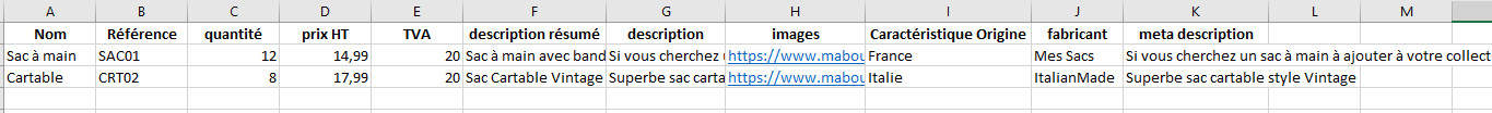 Vous pouvez créer un produit de A à Z, c'est-à-dire ajouter toutes les informations nécessaires telles que référence, quantité, prix, images, descriptions, fabricant, caractéristiques, données meta, etc, en un seul import !