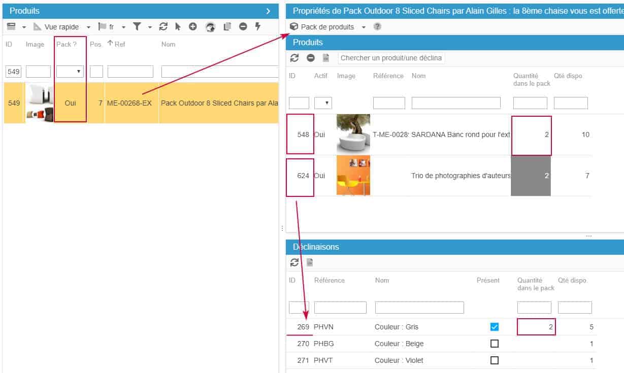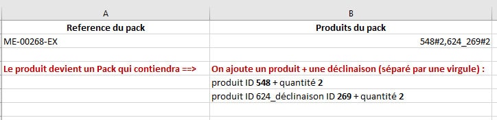 Pour définir les produits d'un pack, on utilise l'ID du produit ainsi que la quantité (que vous souhaitez inclure dans le pack) avec le format id#quantité