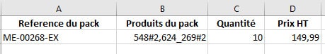 Voici l'exemple d'un fichier csv avec lequel nous allons définir le produit dont la référence est ME-00268-EX en tant que pack.