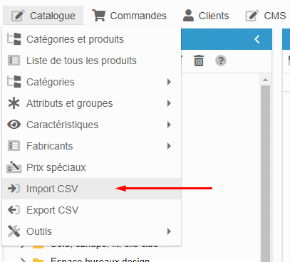Pour cela rendez-vous dans Catalogue > Import CSV