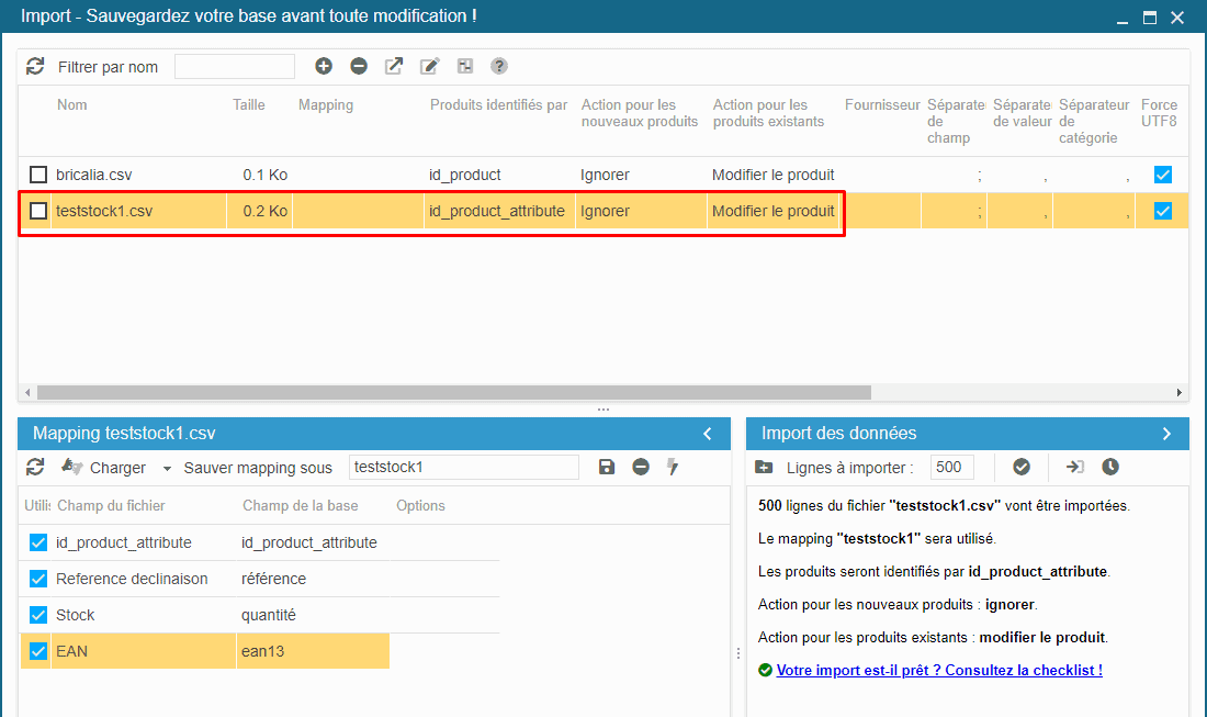 J'identifie donc mes déclinaisons par id_product_attribute et mes actions seront sur "Ignorer + modifier".