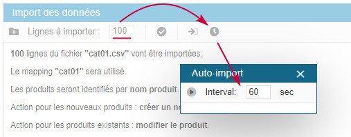 Choisissez de traiter 100 lignes du fichier CSV toutes les 60 secondes. Si votre serveur met 30 secondes à traiter ces lignes, vous pouvez paramétrer l'outil d'auto-import à 40 secondes pour laisser une marge et le relancer. Si une erreur se produit, l'import s'arrêtera et un encart rouge vous alertera.