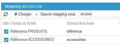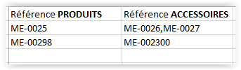 Notez que vous pouvez associer plusieurs références (accessoires) au même produit en saisissant toutes ces références dans la même cellule, séparées par une virgule (si le séparateur de valeur utilisé dans la configuration d'import est aussi la virgule). L'exemple ci-dessous affiche cette possibilité.