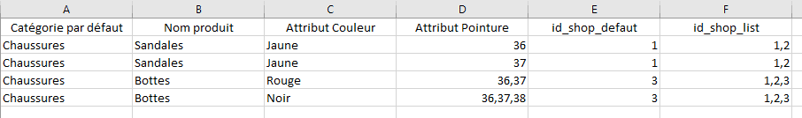 Pour associer ces produits et déclinaisons à plusieurs boutiques, il suffit d'insérer deux colonnes supplémentaires :