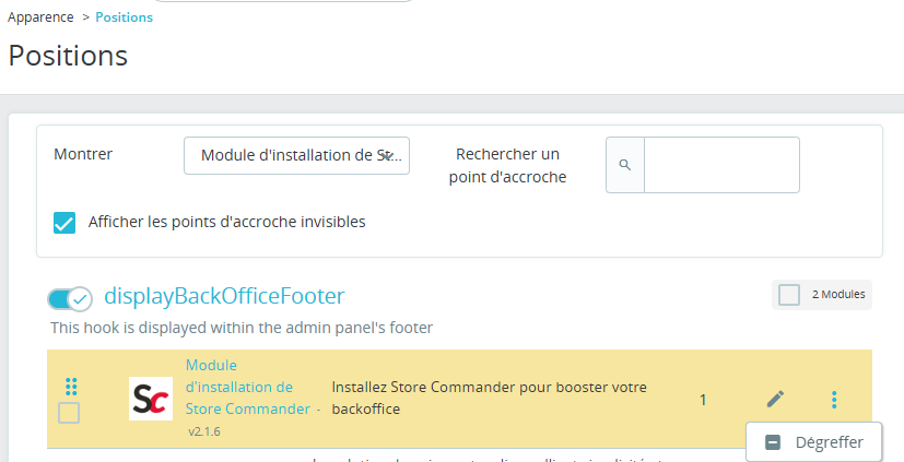 Retrouvez ces points d'accroche dans Apparence > Positions : sélectionnez le module d'installation Store Commander dans 'Montrer'.