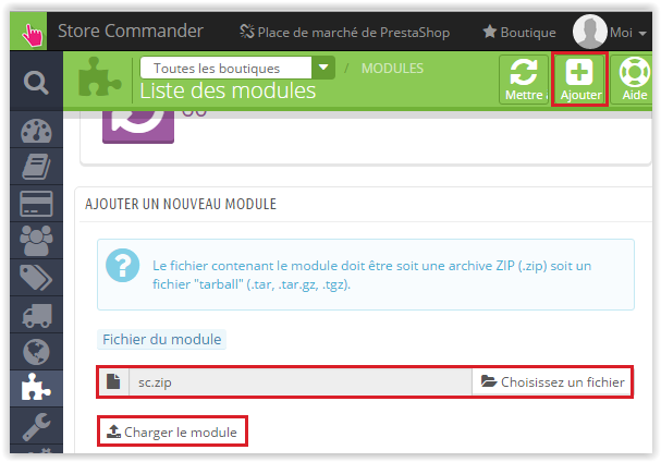 A partir du menu Modules du backoffice PrestaShop, cliquez sur 'Ajouter', sélectionnez le fichier sc.zip et chargez-le.