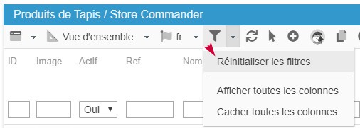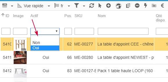 Vous pouvez ainsi filtrer la liste des produits pour par exemple affichés uniquement les produits activés, en sélectionnant 'oui' dans le menu déroulant de la colonne Actif :
