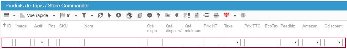 Ici, la ligne de filtre de la vue Rapide dans l'interface Produits :