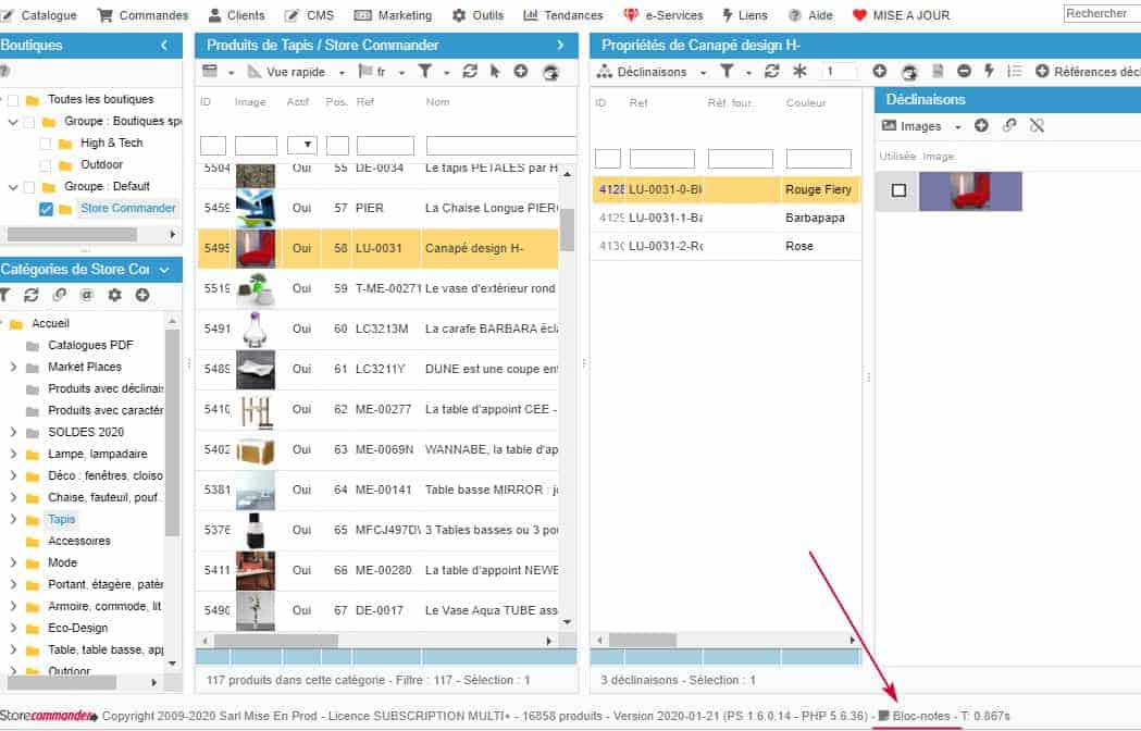 Store Commander met à disposition un bloc notes, accessible depuis toutes ses interfaces (Catalogue, Commandes, Clients, etc) car il se situe sur la barre d'état en bas de l'interface :