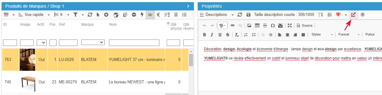 Dans l'interface dédiée au fabricants/marques (menu Catalogue > Fabricants), le raccourci se trouve sur la barre d'outils Descriptions pour un fabricant sélectionné :