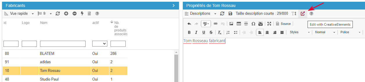 Si vous travaillez avec le module Creative Elements, vous retrouverez alors à plusieurs endroits dans Store Commander un raccourci vers la page d'édition Creative Elements.