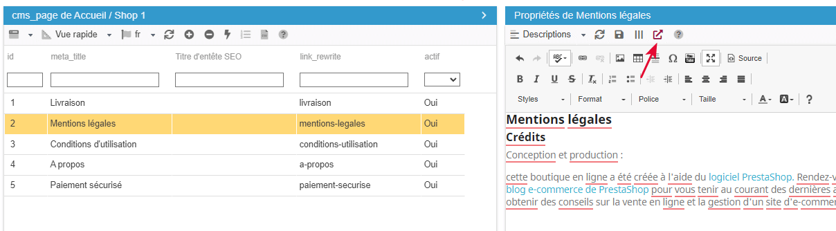Dans la propriété Descriptions des pages CMS, dans l'interface dédiée, menu CMS sur la barre principale de Sc :