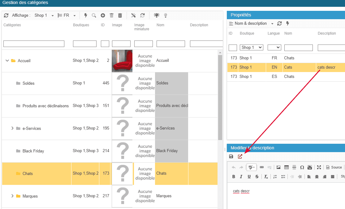 Dans l'interface dédiée aux catégories (menu Catalogue > Catégories), vous retrouvez l'icône dans le panneau Description en bas à droite lorsqu'une catégorie est sélectionnée :