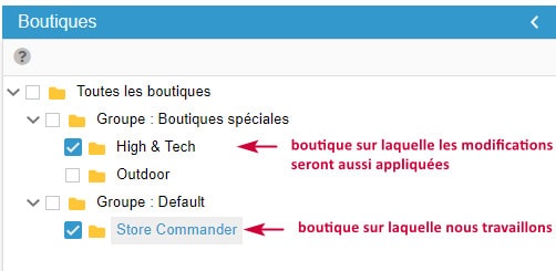 Le principe de cet arbre à boutiques dans Store Commander est de sélectionner une seule boutique (cochée et surlignée).