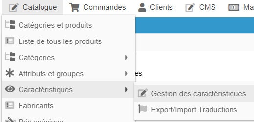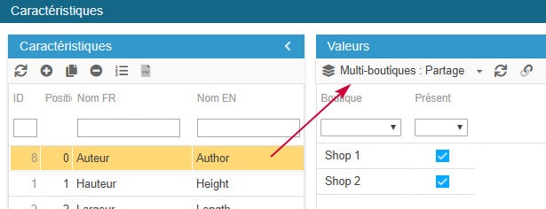 En mode Multiboutiques, PrestaShop permet de rendre disponibles ou non les caractéristiques produits sur vos différentes boutiques (association de boutiques).