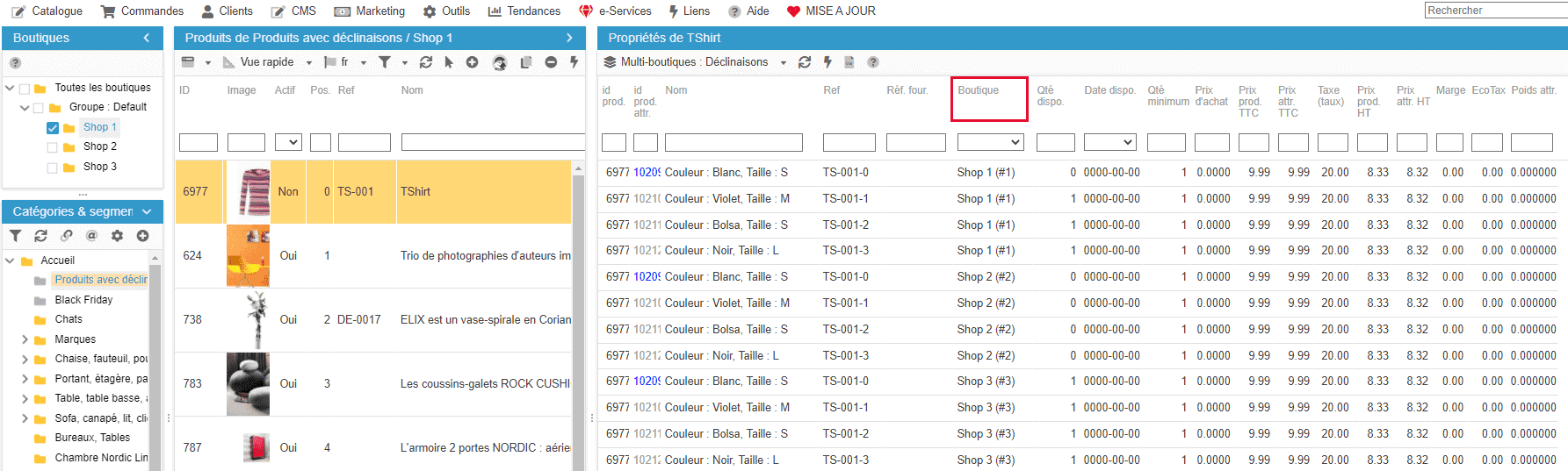 Dans cette grille vous verrez toutes les déclinaisons du produit sélectionné avec toutes les informations des déclinaisons par boutique, que vous pouvez visualiser grâce à la colonne 'Boutiques';