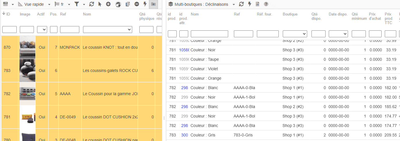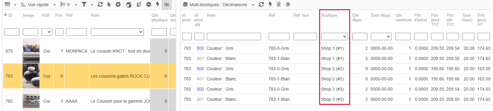 Les déclinaisons peuvent exister sur plusieurs boutiques et les informations telles que les prix, les stocks peuvent être spécifiques à chaque boutique.
