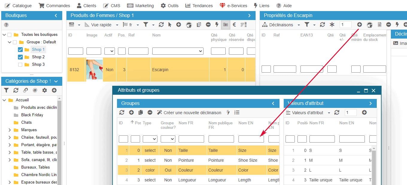 Vous pouvez vérifier dans la grille Multiboutique Partage que la déclinaison est bien présente dans Shop 1 et Shop 2, qui correspond à la configuration de votre arbre à boutiques.