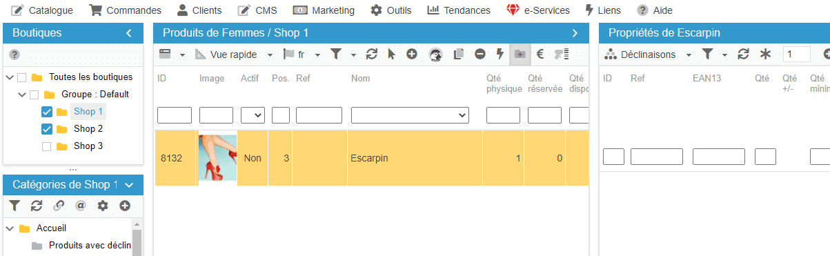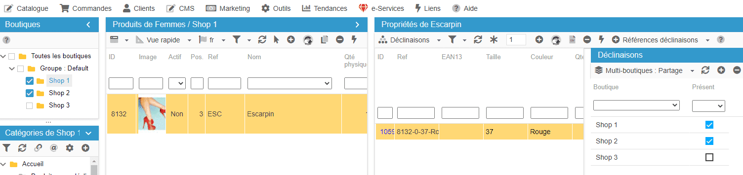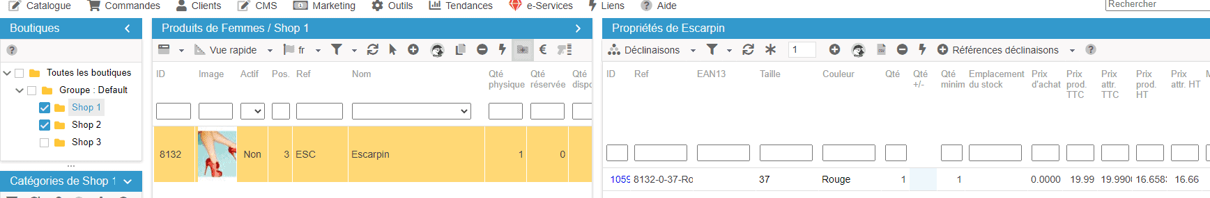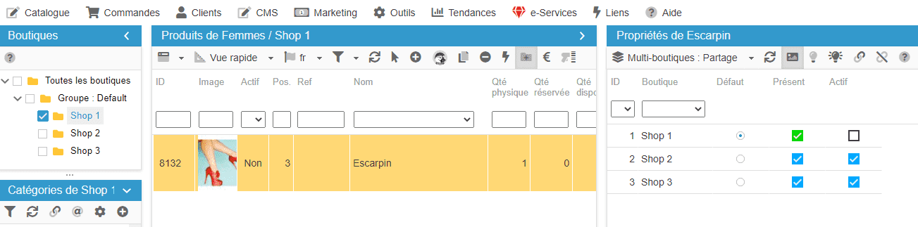 Dans cet exemple le produit existe sur les 3 boutiques.