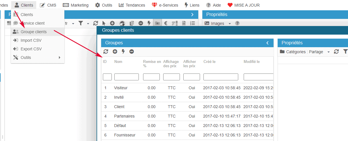 Pour associer les groupes clients à vos différentes boutiques, rendez-vous dans le menu Clients > Groupes clients.