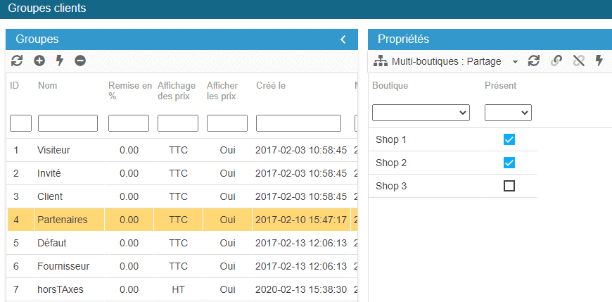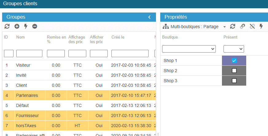 Pour les associer à vos différentes boutiques, affichez la grille Multiboutiques Partage dans la colonne des Propriétés à droite.