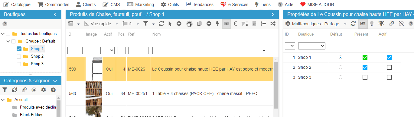 Vous trouverez une grille intitulé Multiboutiques : Partage dans la colonne des Propriétés, à droite qui vous indiquera dans quelle(s) boutique(s) un produit (sélectionné) se trouve : la case 'Présent' sera cochée.