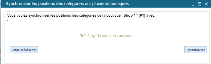 Si vous travaillez en mode mulitboutiques, l'option de synchronisation des catégories, accessible depuis le menu Catalogue, permet en quelques secondes d'appliquer les modifications de positions de vos catégories d'une boutique sur plusieurs autres, à partir du moment où les arborescences sont les mêmes sur chacune des boutiques.