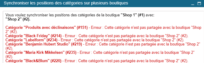 S'il s'avère que certaines catégories ne sont partagées entre les boutiques sélectionnées, Store Commander vous en affichera les détails afin que vous puissiez être informé et corriger le problème si besoin est.