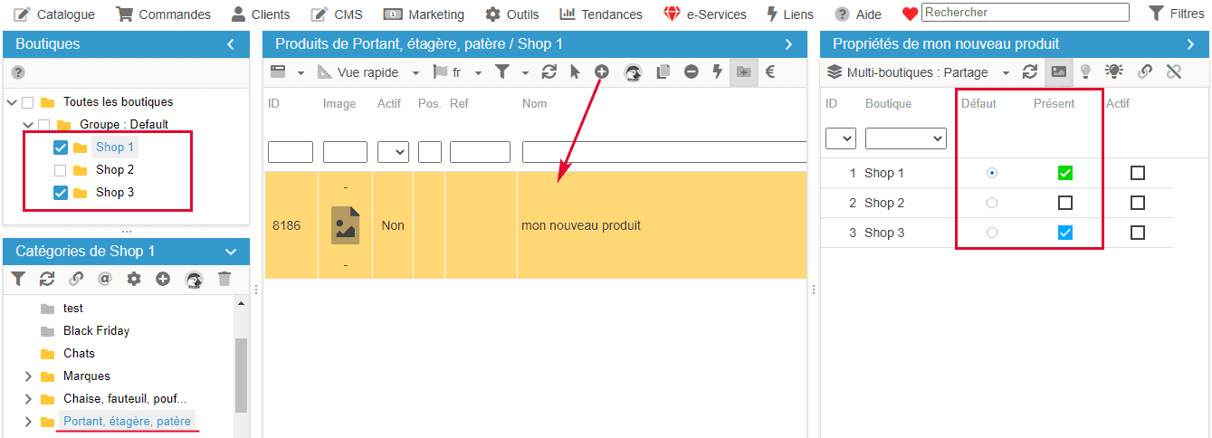 En une seule manipulation, votre produit est ainsi créé dans toutes les boutiques indiquées dans la configuration de votre arbre à boutiques, ce que vous pouvez vérifier dans la grille Multiboutiques Partage de la colonne des Propriétés.