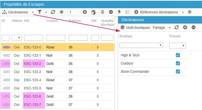 La gestion multiboutiques permet d'associer vos déclinaisons à des boutiques spécifiques, et ce depuis la grille Multiboutiques Partage dédiée aux déclinaisons.