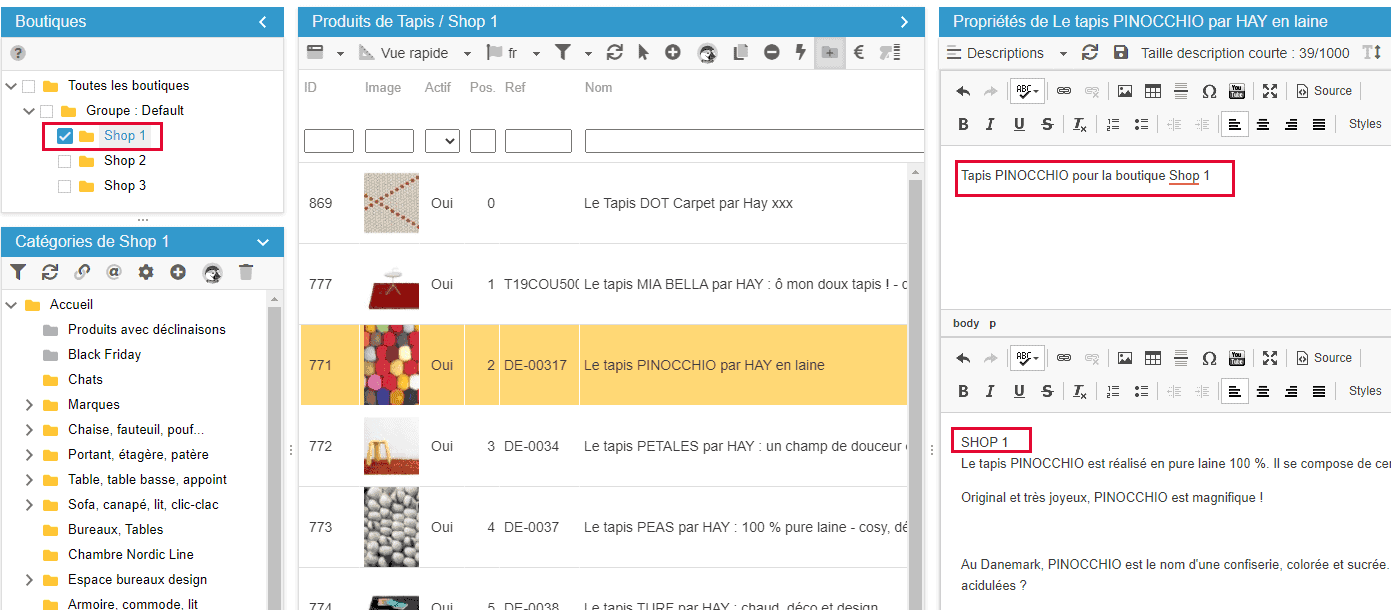 Lorsqu'un produit existe dans plusieurs boutiques, vous avez la possibilité de définir une description spécifique sur chaque boutique, ou bien commune à plusieurs boutiques.