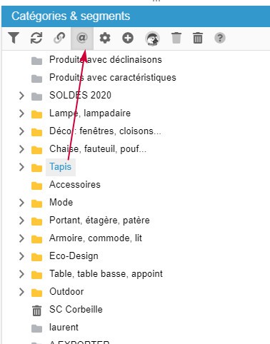 Pour savoir quels sont les produits (affichés dans la colonne centrale) qui utilise la catégorie sélectionnée comme celle par défaut, activez l'option qui se trouve sur la barre d'outils des catégories