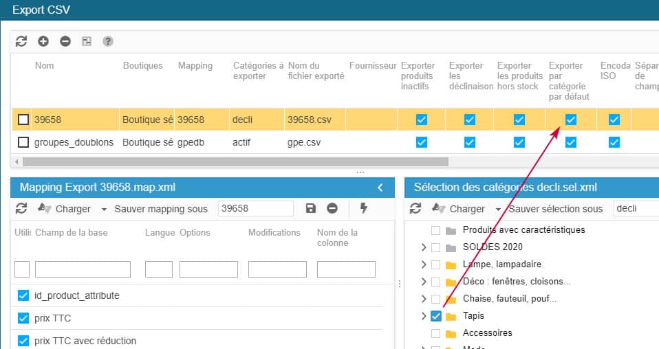 Cette option est très utile lorsque vous faites un export CSV et que le nombre de produits exportés ne correspond pas au nombre de produits affichés dans la catégorie sélectionnée, lorsque l'option 'exporter par catégorie par défaut' est cochée.
