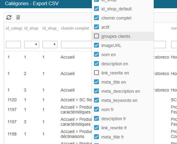 Vous pouvez personnaliser cet export en choisissant les colonnes à prendre en compte, simplement en cachant celles que vous ne souhaitez pas exporter : un clic droit sur les intitulés des colonnes pour afficher la liste ==> décochez les champs que vous ne voulez pas exporter.