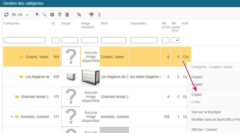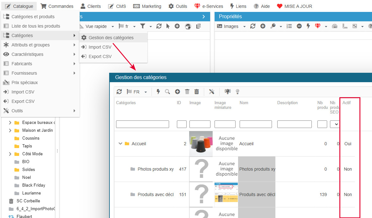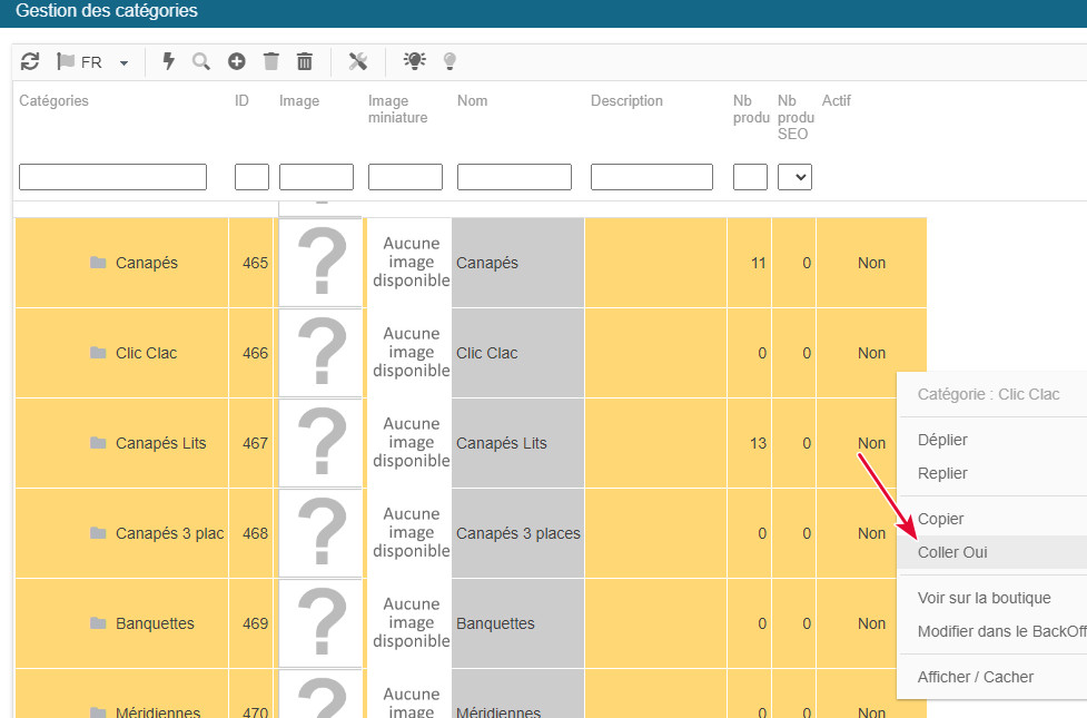 Dans la colonne de l'arborescence de gauche se trouve une colonne 'Actif', qui affichera Oui/Non : catégorie activée ou désactivée sur votre site.