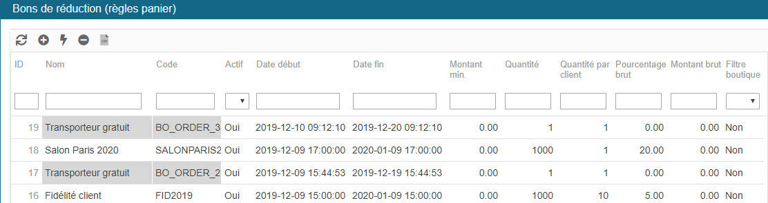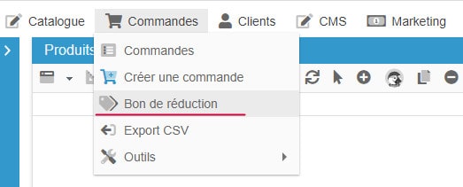 L'interface de Store Commander contient une fenêtre dans laquelle vous pouvez gérer les bons de réduction, accessible depuis le menu Commandes > Bons de réduction (règles panier), notamment afficher et extraire la liste des clients qui ont bénéficier d'un bon de réduction lors de leur commandes.