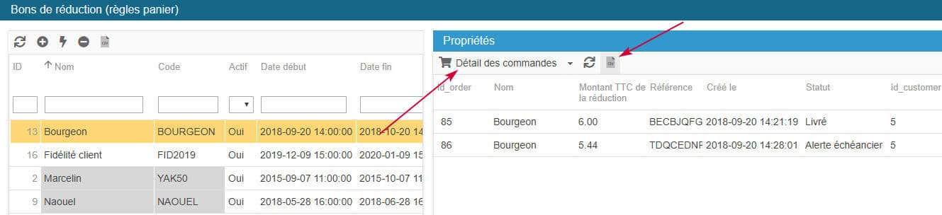 Dans le panneau de droite, ouvrez la grille 'Détail des commandes' qui affichera la liste des clients et leurs commandes qui ont bénéficié du bon de réduction sélectionné.