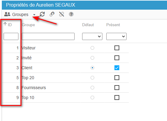 ou depuis la propriété (panneau de droite) > Groupes de l'interface Clients de Sc.