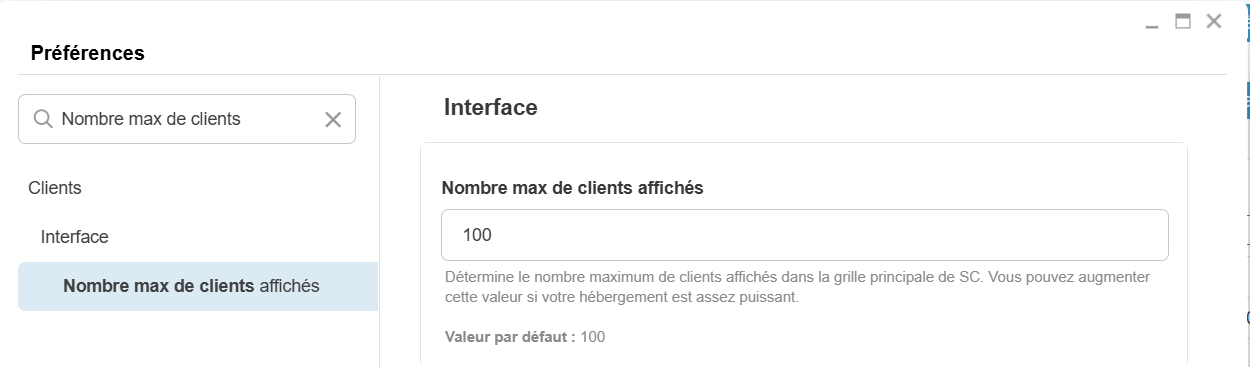 Vous pouvez modifier cette valeur à partir du menu Outils > Préférences > Clients > Nombre max de clients affichés.