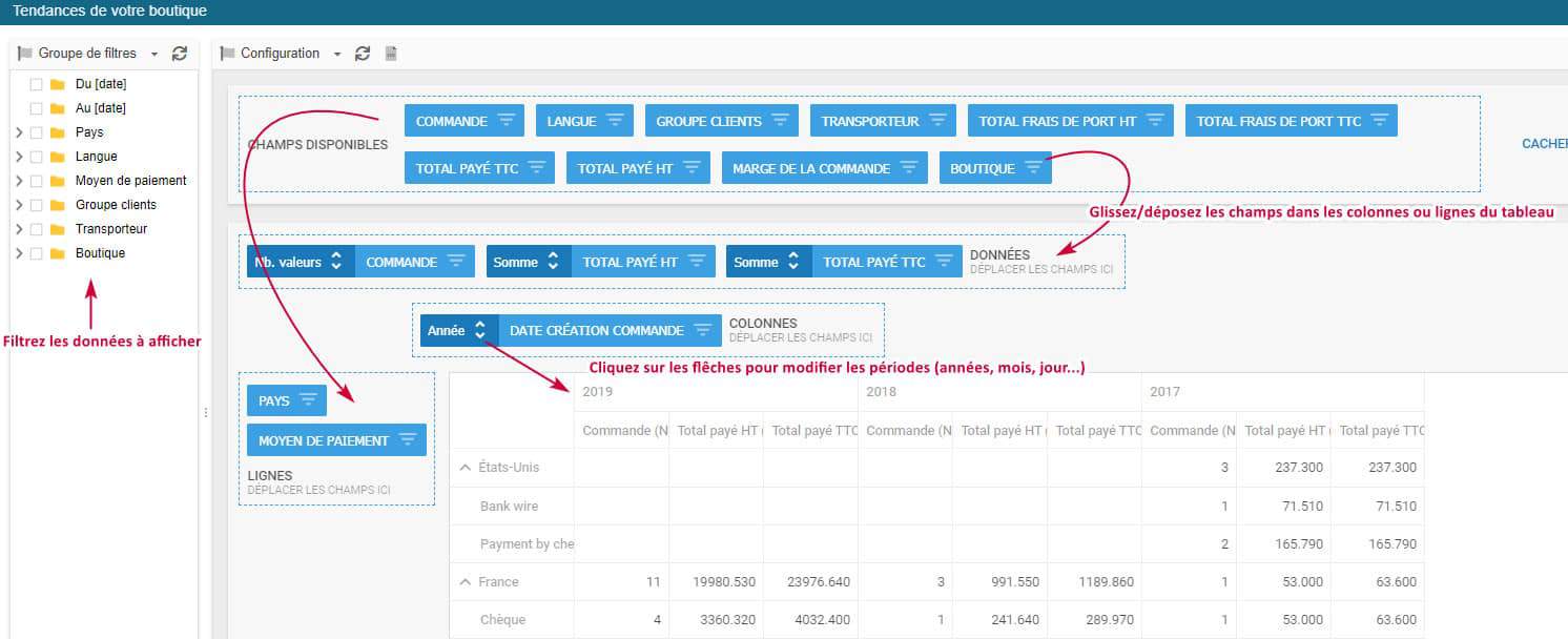 Dans le menu Tendances de Store Commander, vous trouverez les tendances de votre boutique, que vous pouvez personnaliser comme vous le souhaitez en manipulant les options et fonctionnalités disponibles.
