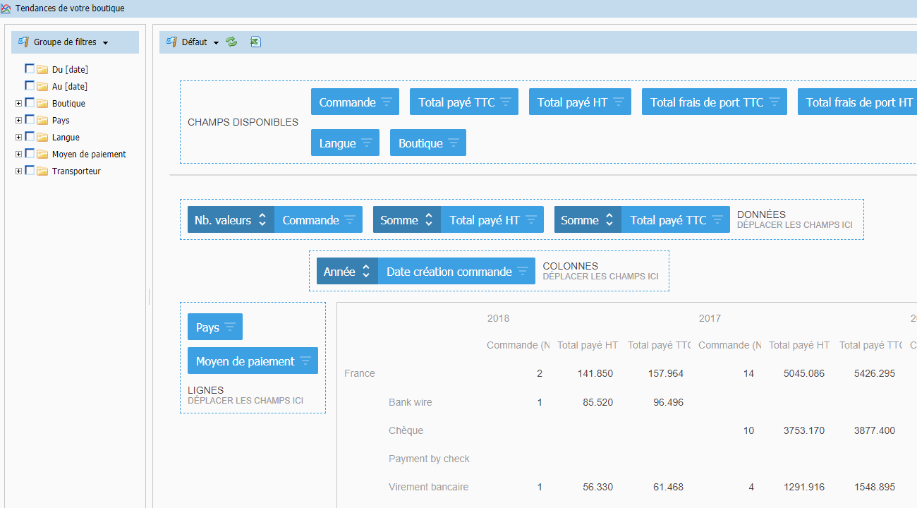 La colonne de gauche est dédiée aux différents filtres que vous pouvez utilisez pour personnaliser l'affichage des tendances de votre boutique.